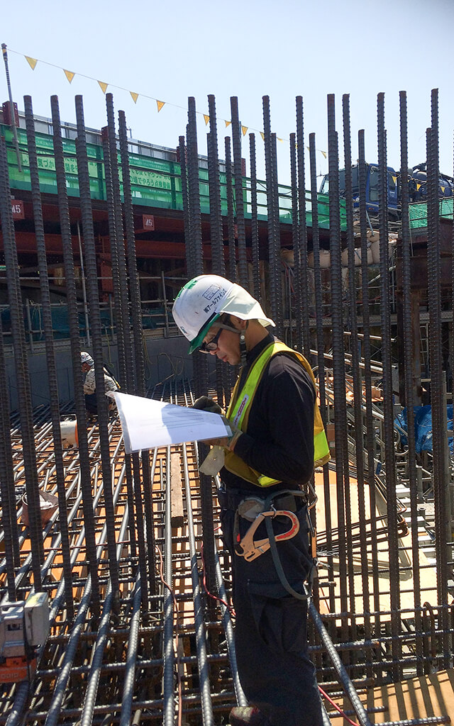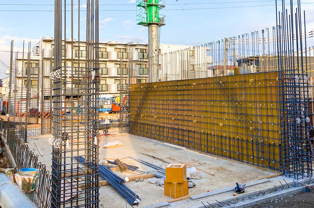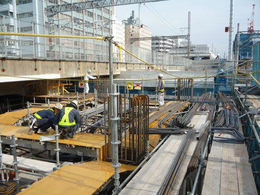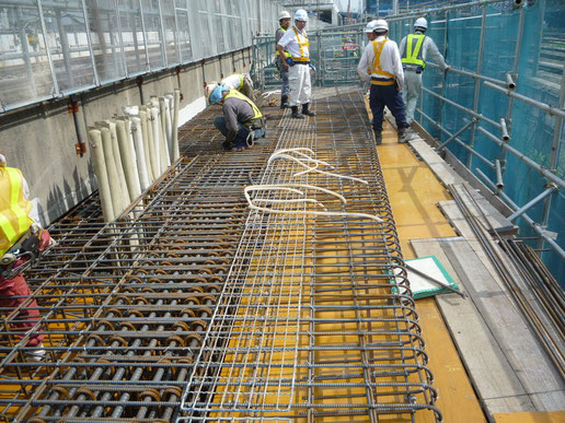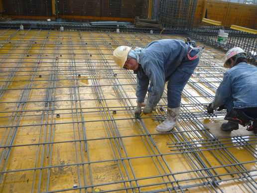主筋と副筋を格子状(籠状)に配筋していきます。鉃筋径・本数・ピッチ・カブリ・ラップ長・定着長、全て図面通りに組立を行います。段取時、頭で組立予習をするとスムーズに施工できます。