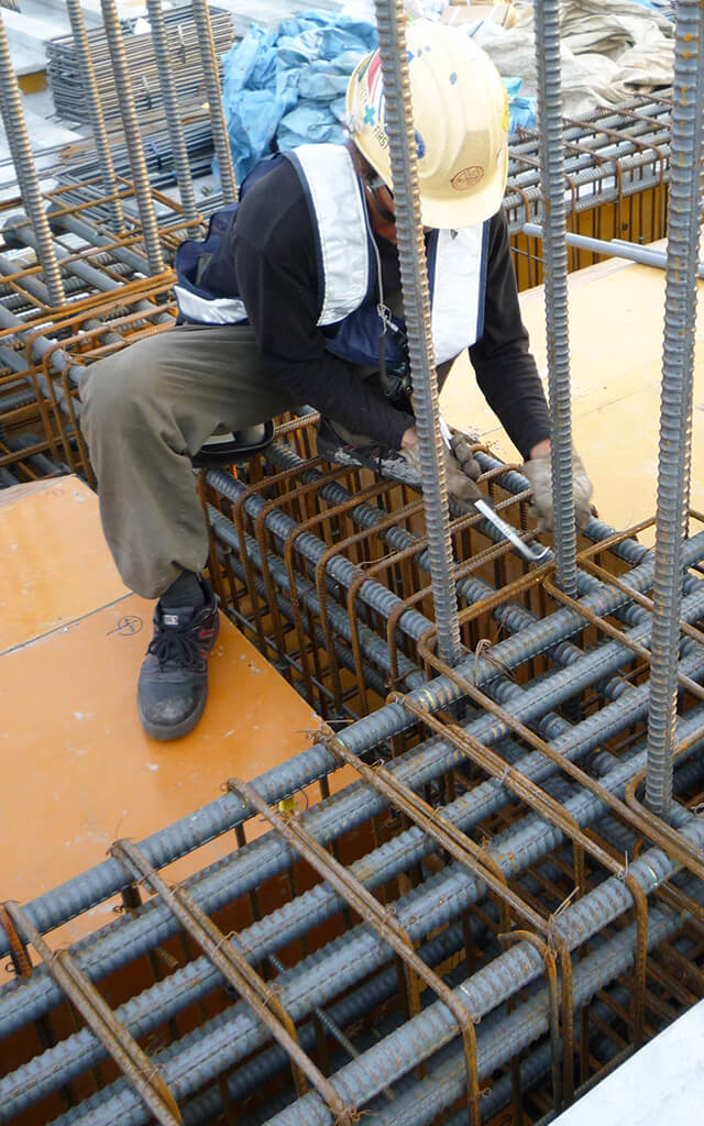 鉃筋同士の交点をハッカー、結束線で水平垂直平行に綺麗に結束していきます。鉃筋のカブリ10㎜で10年と言われますので、結束線のヒゲの折込にも細心の注意を払っています。