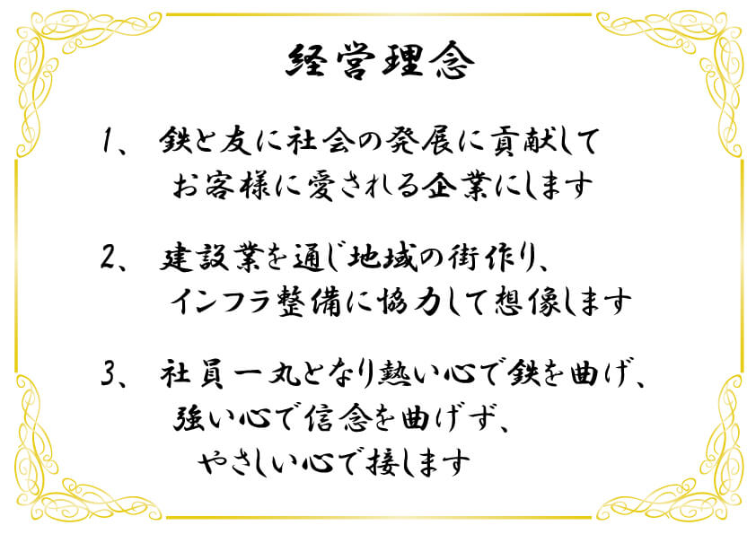 弊社は2003年の創業以来、土木、建築の鉃筋工事を主体に安全第一とポジティブをモットーに取引先各位への感謝の念を常に忘れず誠心誠意努力を重ねて参りました。